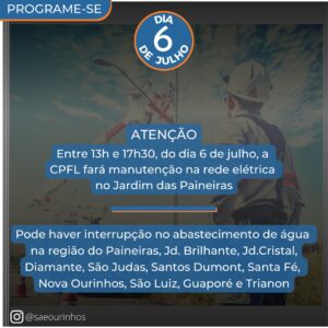 Atenção moradores do Jd. das Paineiras e adjacências haverá falta d´água nesta 3ª feira Redação 27 de junho de 2023 Principal Compartilhe COMUNICADO DA SAE: Atenção moradores do Jd. das Paineiras, Jd. Brilhante, Jd. Cristal, Santos Dumont, Santa Fé, Nova Ourinhos, Guaporé, Vila São Luis e Trianon . Haverá falta d´água no periodo das 13 as 17 horas .