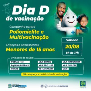 Ourinhos inicia na manhã de sábado (20) a Campanha Nacional de Vacinação contra a poliomielite (para crianças menores de cinco anos) e Multivacinação para Atualização da Caderneta de Vacinação da Criança e do Adolescente (menores de 15 anos de idade) dos imunizantes que constam no Programa Nacional de Imunizações (PNI).