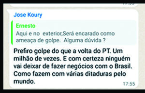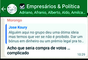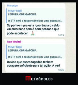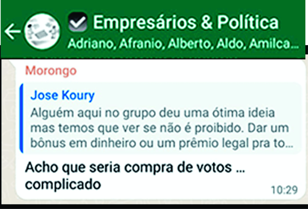 Morongo é um dos empresários com visões mais extremistas no grupo e defende que o Brasil está em guerra contra os adversários de Bolsonaro. Ao responder à defesa do golpe feita por Koury, o dono do shopping Barra World, Morongo escreveu três mensagens consecutivas.