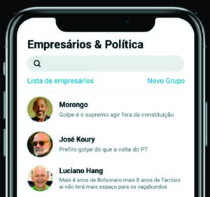 A defesa explícita de um golpe, feita por alguns integrantes, se soma a uma postura comum a quase todos: ataques sistemáticos ao Supremo Tribunal Federal (STF), ao Tribunal Superior Eleitoral (TSE) e a quaisquer pessoas ou instituições que se oponham ao ímpeto autoritário de Jair Bolsonaro. O grupo, cujos bastidores serão contados pelas próximas reportagens, reúne grandes empresários de diversas partes do país, como Luciano Hang, dono da Havan; Afrânio Barreira, do Grupo Coco Bambu; José Isaac Peres, dono da gigante de shoppings Multiplan; José Koury, dono do Barra World Shopping, no Rio de Janeiro; Ivan Wrobel, da construtora W3 Engenharia; e Marco Aurélio Raymundo, o Morongo, dono da marca de surfwear Mormaii.