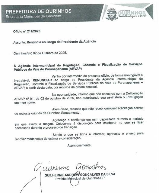 O prefeito de Ourinhos, Guilherme Gonçalves, renunciou à presidência da ARVAP (Agência Intermunicipal de Regulação e Fiscalização de Serviços Públicos do Vale do Paranapanema). A decisão foi formalizada em um ofício datado de 2 de outubro de 2025, no qual o gestor alegou motivos pessoais para deixar o cargo de forma definitiva.