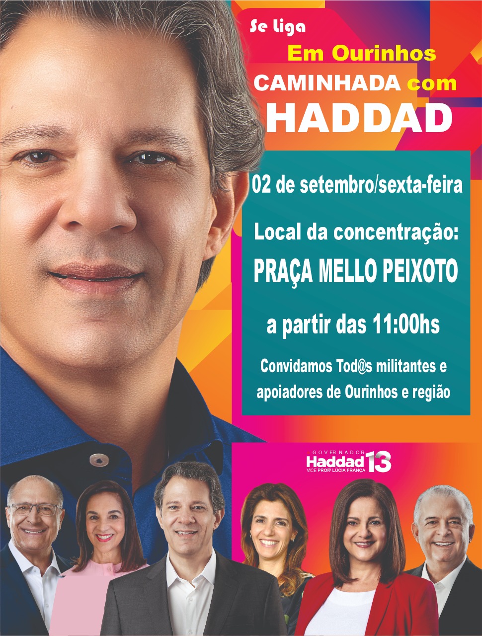 Fernando Haddad, Geraldo Alckmin e o grupo deverão se encontrar com os simpatizantes e apoiadores locais, militantes do Partido dos Trabalhadores e partidos aliados na Praça Melo Peixoto às 11 horas.